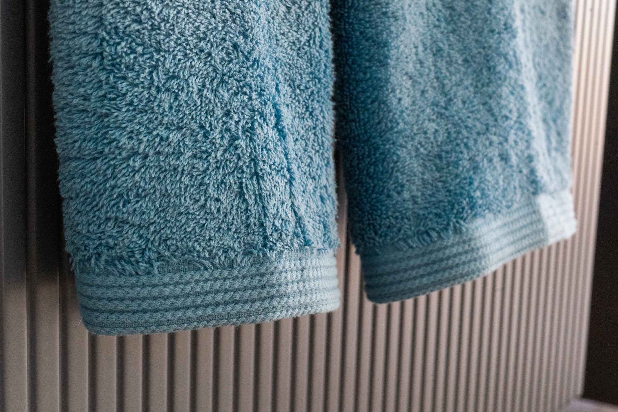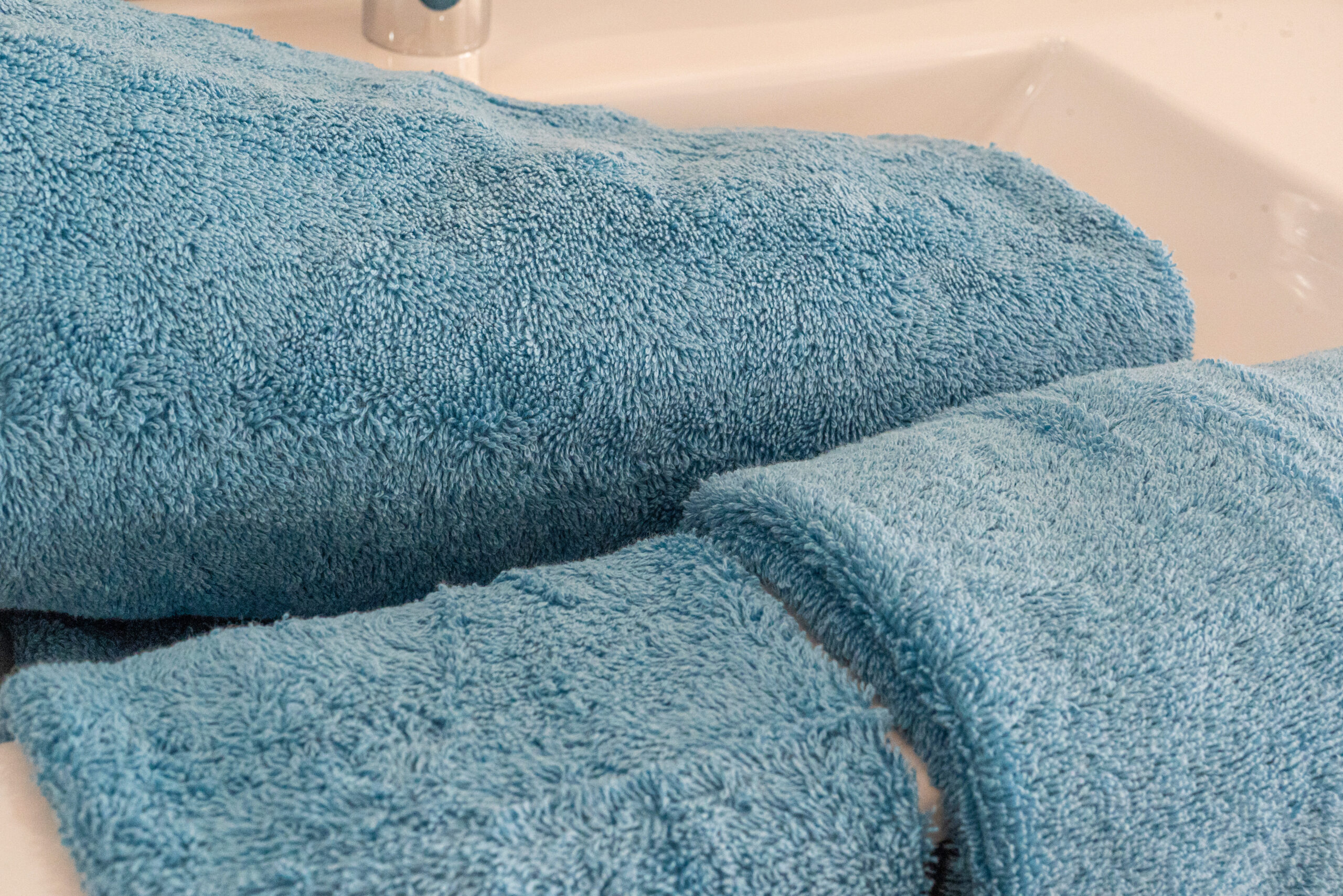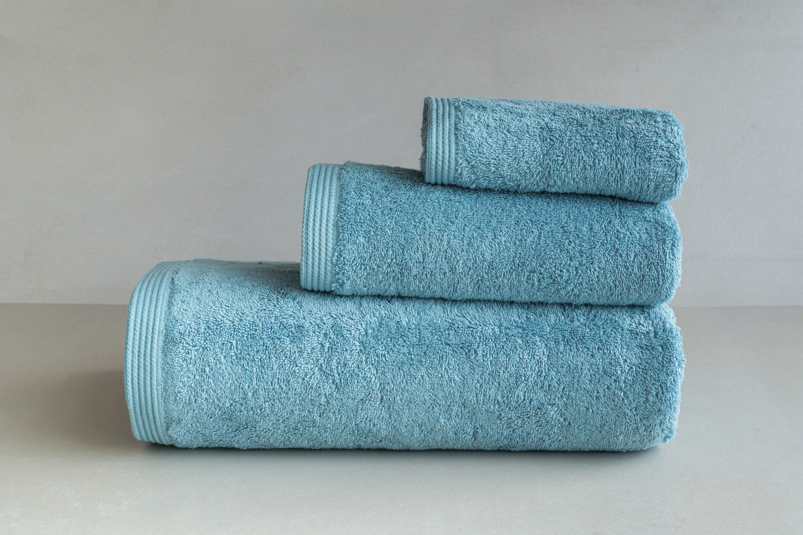 Conjunto de Banho Liso Azul Claro em algodão penteado. Macio, absorvente e fabricado em Portugal.