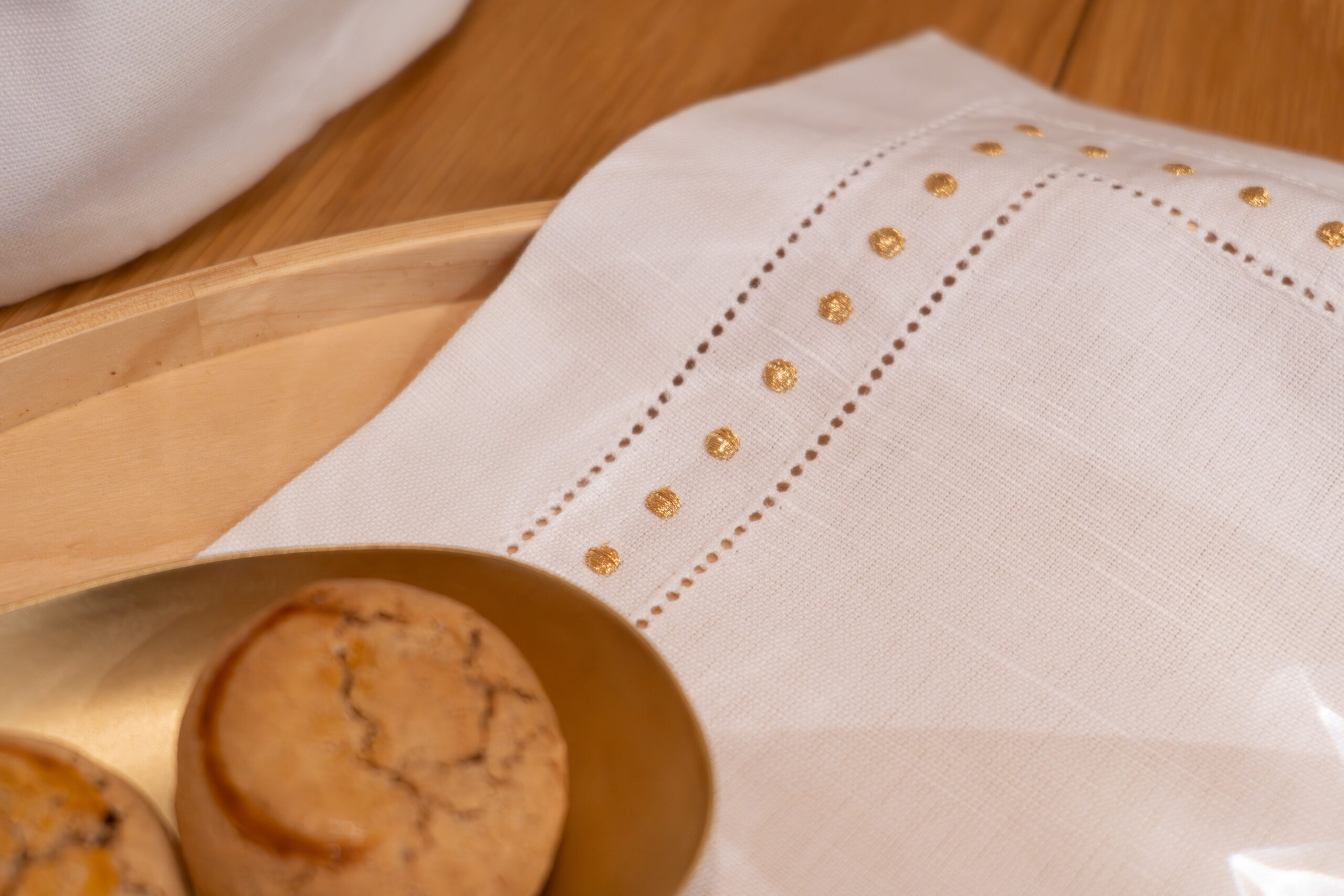 Pano de Tabuleiro Linho Bolinhas Dourado