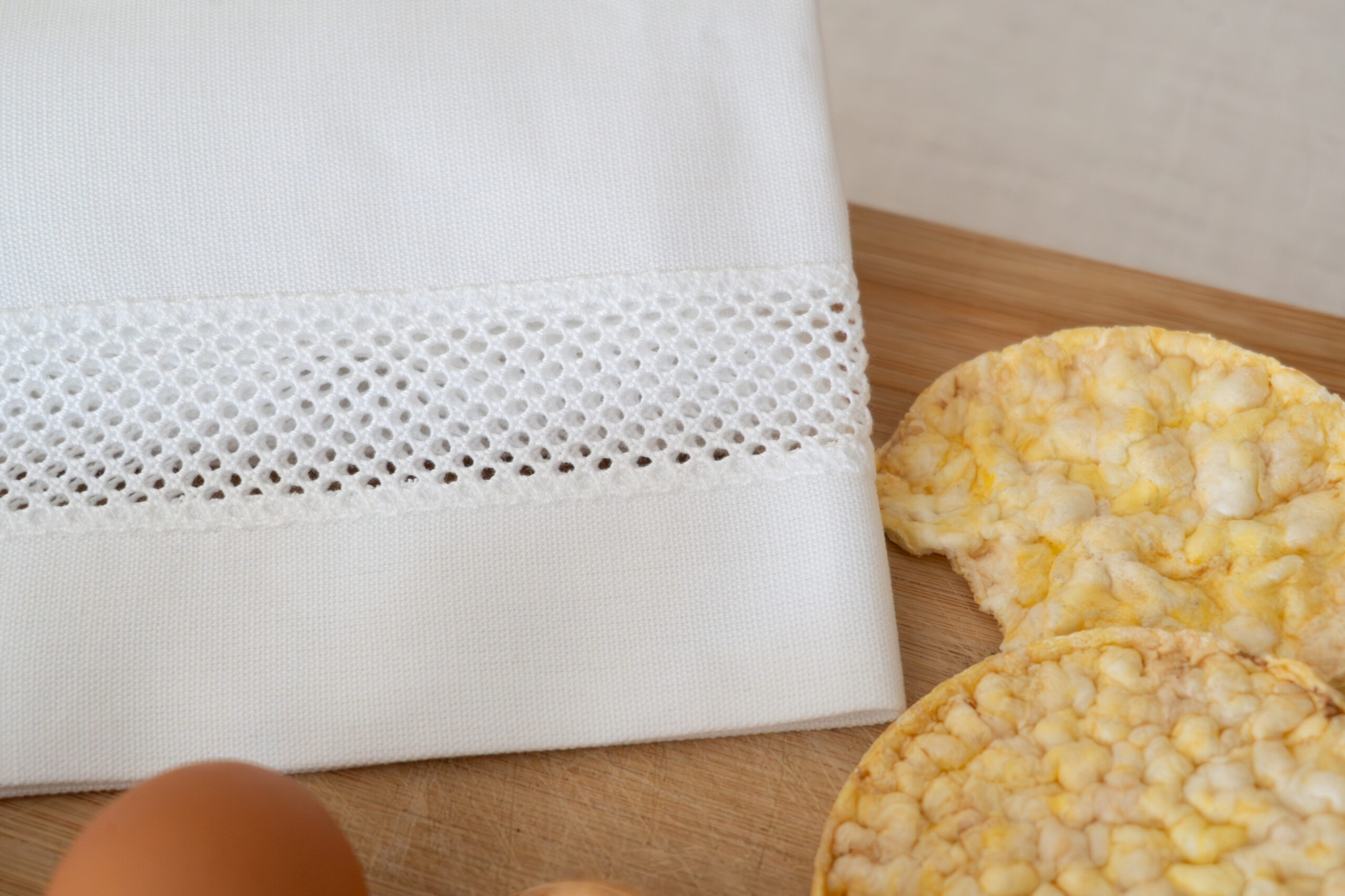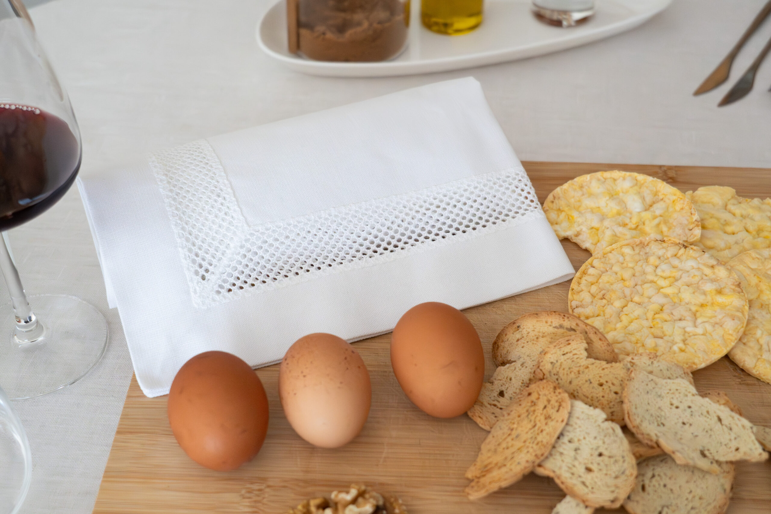 Em linho e algodão, com detalhe vazado de inspiração artesanal. Funcional e elegante, acrescenta sofisticação discreta à mesa e ao servir.