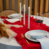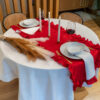 O runner vermelho, em 100% linho, traz sofisticação e aconchego à mesa. Com textura natural e cor intensa, valoriza a decoração e é perfeito para ocasiões especiais.